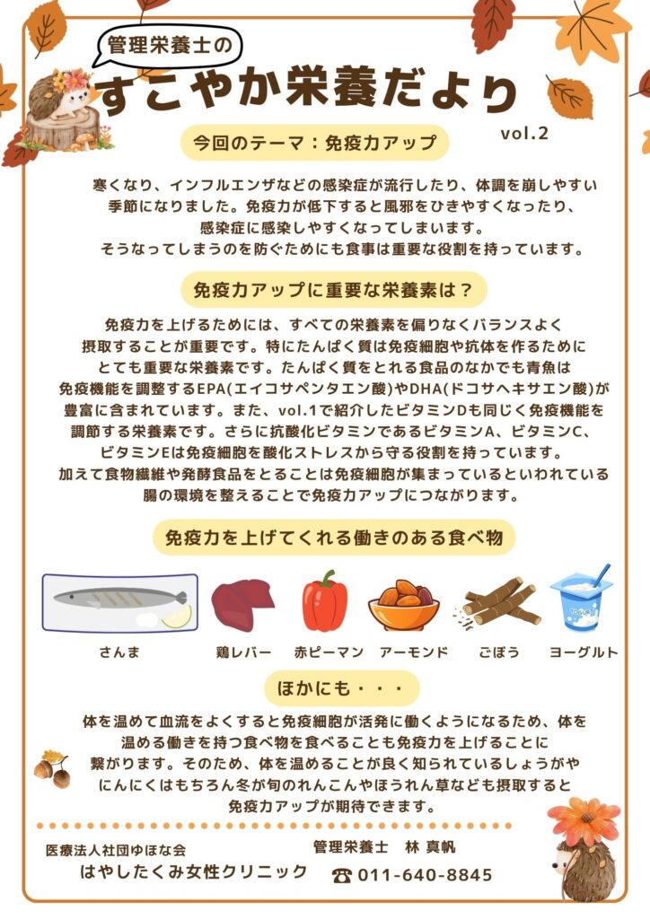 管理栄養士監修のすこやか栄養だよりvol.2が発行されました🎵 今回のテーマは『免疫力アップ』です😊 寒さが身に染みる季節になってきましたね☁ このお便りをヒントに寒さに負けない免疫をつけて乗り切りましょう✨