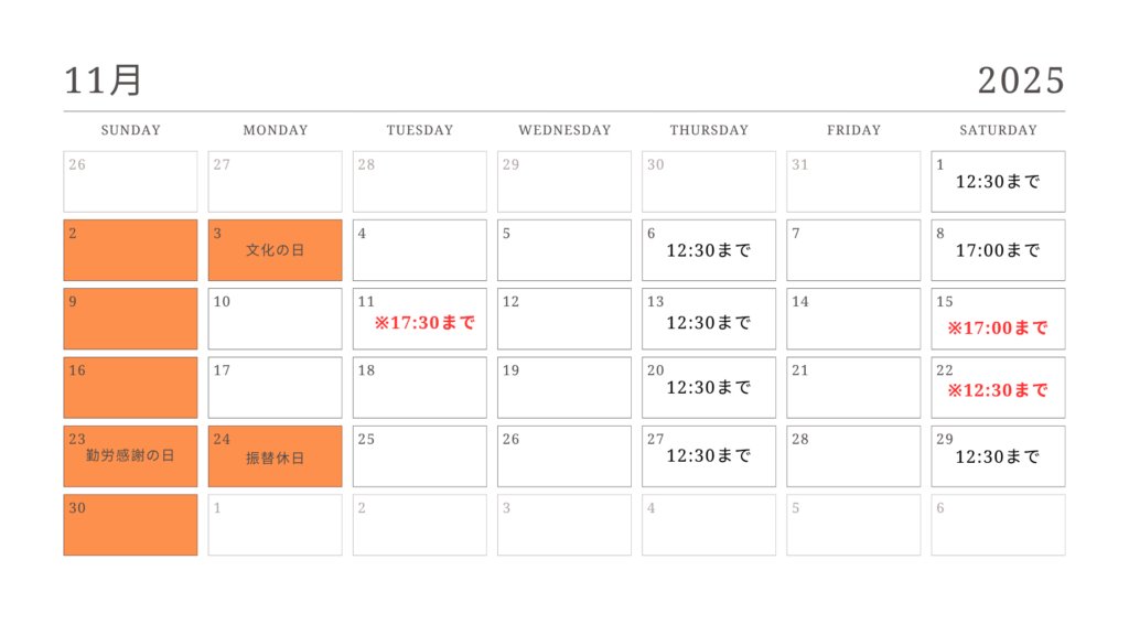 🔴11/11(火)は17:30までの受付とさせていただきます