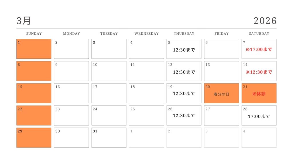 🔴土曜日の診療時間に変更が生じているところがございます。詳しくはカレンダーにてご確認ください